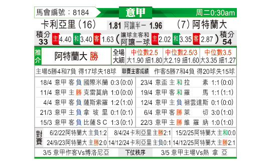 [意甲] 卡利亚里vs亚特兰大